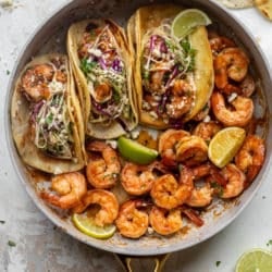 Tender, juicy shrimp in a sticky honey chipotle sauce are served in crispy flour tortillas with crumbly cotija cheese and the crunchiest lime slaw. The texture! The crunch! And the flavor is just unreal.