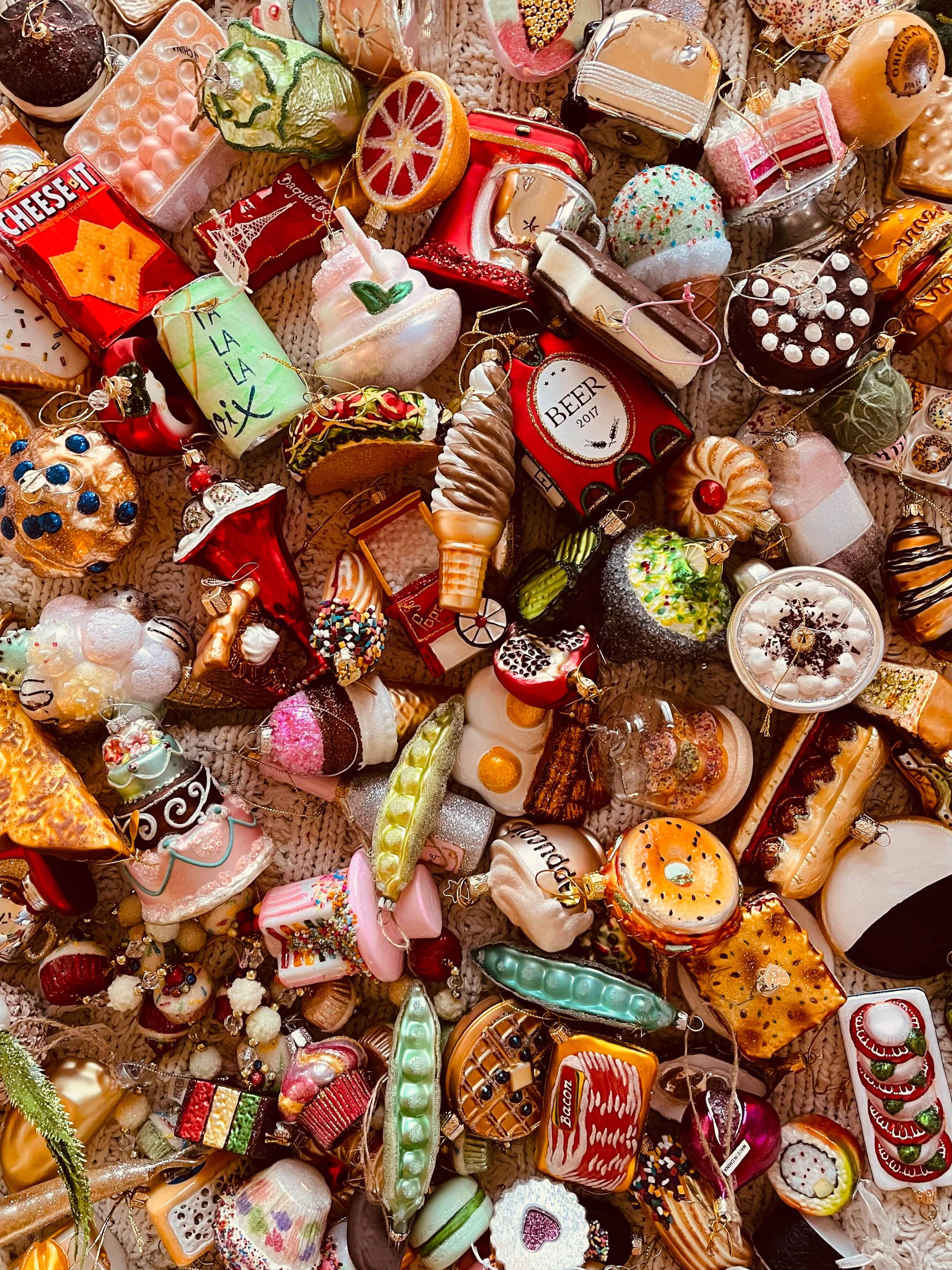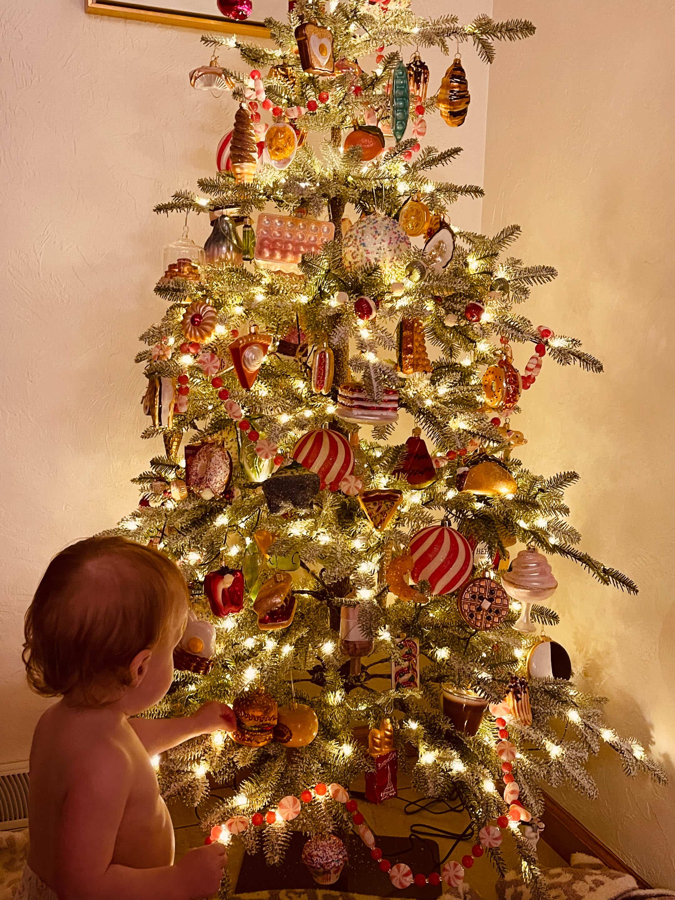 We broke out the kitchen tree first!! If you’re new, you can read all about my kitchen tree and food ornaments here. I’ve been collecting food ornaments for over a decade now.