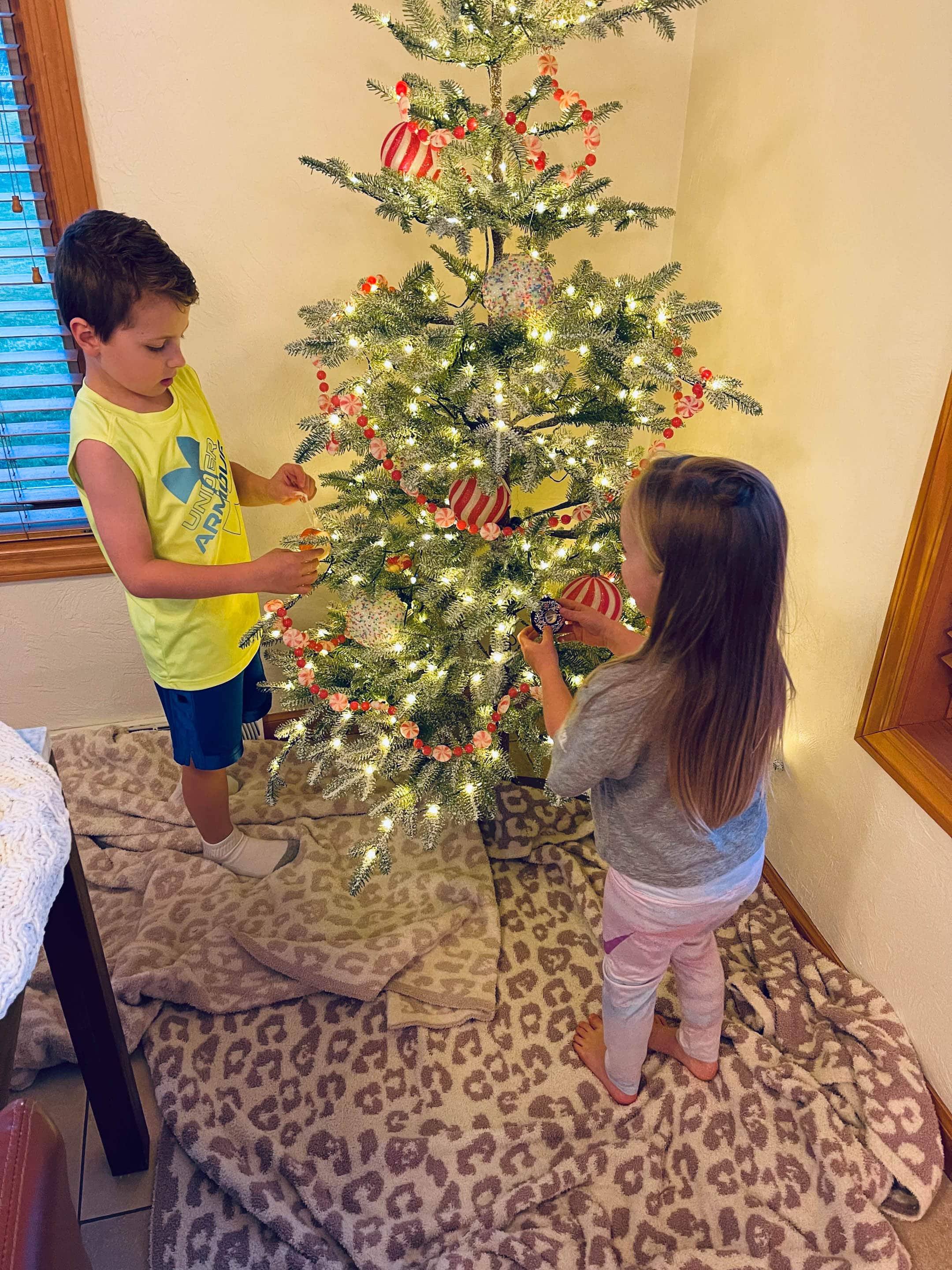 I always put fluffy blankets on the floor because I break ornaments every year… the blown glass and the tile floor – ugh. This is Max and Emilia’s favorite tree to do!