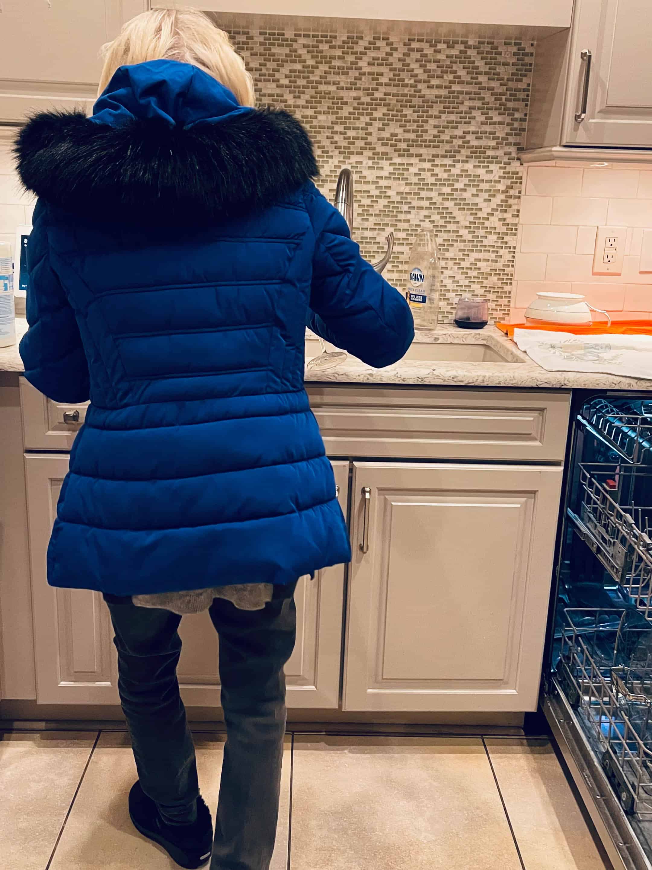 My mom was so cold doing dishes with me that she wore her slippers and winter coat.