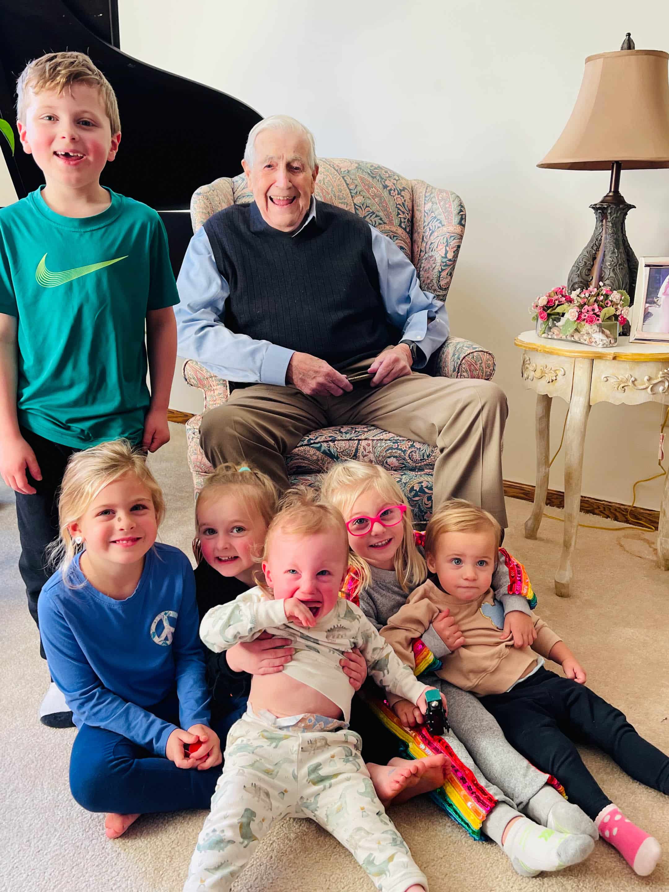 My grandpa (he’s 94) with all the great grandkids! Jordan wasn’t into it. How cute!!