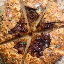 This french onion galette is a super fancy yet simple meal. Gruyere thyme crust is filled with caramelized onions and baked until cozy, warm, satisfying and delicious. Serve with a greens salad for the perfect plate!
