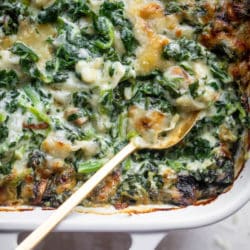 This spinach gratin recipe is sponsored by ALDI! This dish is incredibly creamy, hearty, has a touch of spice and is loaded with gruyere and parmesan cheese. It’s absolutely delicious and makes for the perfect side dish to any holiday. It’s easy as can be, is great to prep ahead of time and also reheats beautifully.