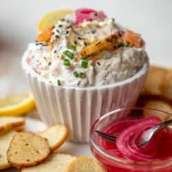 This everything bagel dip is filled with torn smoked salmon, herbs like dill and chives, some lemon and tons of everything bagel seasoning. It’s delicious served on toast, pita crackers, bagel chips or even with veggies.