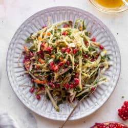 My winter slaw is super crunchy, crisp, refreshing and tangy, filled with cabbage, pears, kale, pomegranate and more. It’s tossed in a citrus vinaigrette that highlights the flavors of the produce and keeps you coming back for bite after bite.