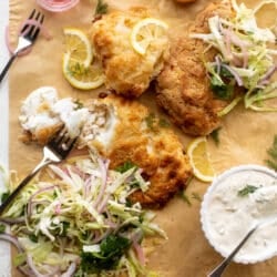We adore this air fryer beer battered fish. Super flaky and buttery fish is coated in a light and crispy beer batter, easily made in the air fryer in under 15 minutes without any deep frying. It’s so delicious served with our flavor slaw and tartar sauce!