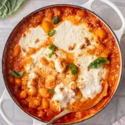 I don’t ever cook the gnocchi when I’m making this dish. It goes right into the oven in the sauce and cooks so super quickly, that you don’t need to worry about boiling it before. Simple!