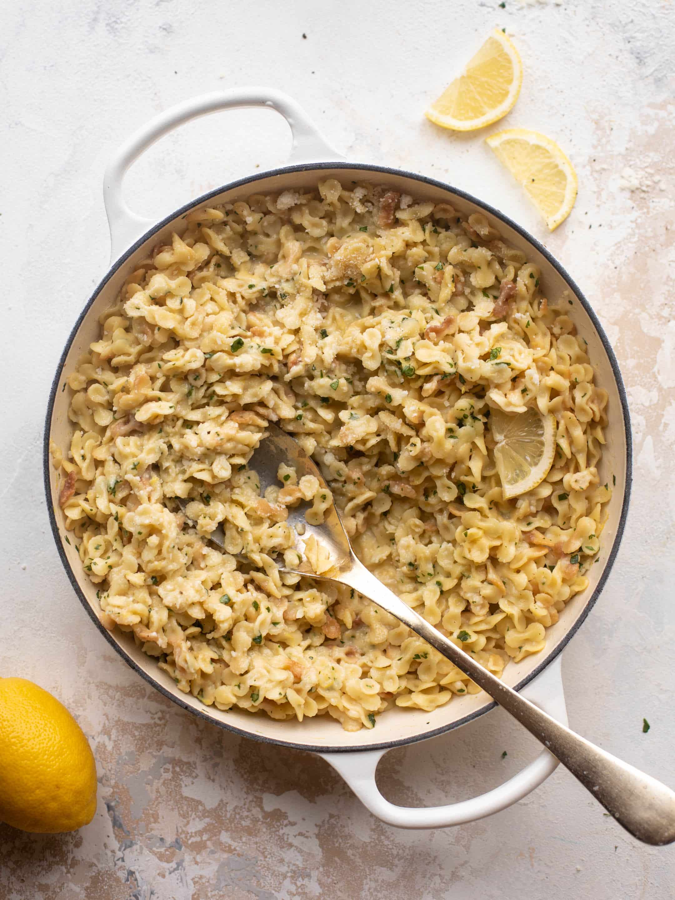 If you have a copy of Everyday Dinners, you know I have a recipe for a cheesy lemon orzo in the book. It’s baked, almost like a light lemon orzo mac and cheese – and it’s divine. I make a version of it often for dinner, and end up using any cut of pasta I have in the house. Sometimes I even mix pastas if I have a few left of each!