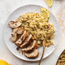This dish is cozy, satisfying and COMPLETE. A full meal right here, and you can throw in some roasted vegetables. Creamy, lemony pasta tossed with parmesan and baked until tender. Juicy, flavorful chicken sliced and served with it for a dinner that you will love.