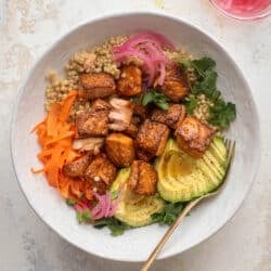I am all about easy weeknight bowl meals that help dinner come together quickly, even during the busiest of day. This is one of those! And it’s super versatile – you can add in anything you like, used leftover already cooked grains or quinoa, even chopped up leftover salmon if you have made my garlic butter salmon. I use my “grain bowl formula” often (you can find it in my book Everyday Dinners) and it’s always a winner. Not an exact recipe, but a method that makes your life easier.