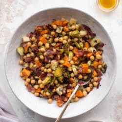 Very good make ahead meal. Next time I’ll roast the potatoes and sprouts separately. The sprouts were done way before the potatoes even when the potatoes were cut into small cubes.