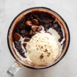 Back in 2020, I decided to make us a quick treat one night. You know, when we were in the thick of things. This mug brownie was born and back then, we topped them with Jeni’s brambleberry crisp ice cream. Oh my gosh – the combo is FABULOUS. I can’t recommend it enough.