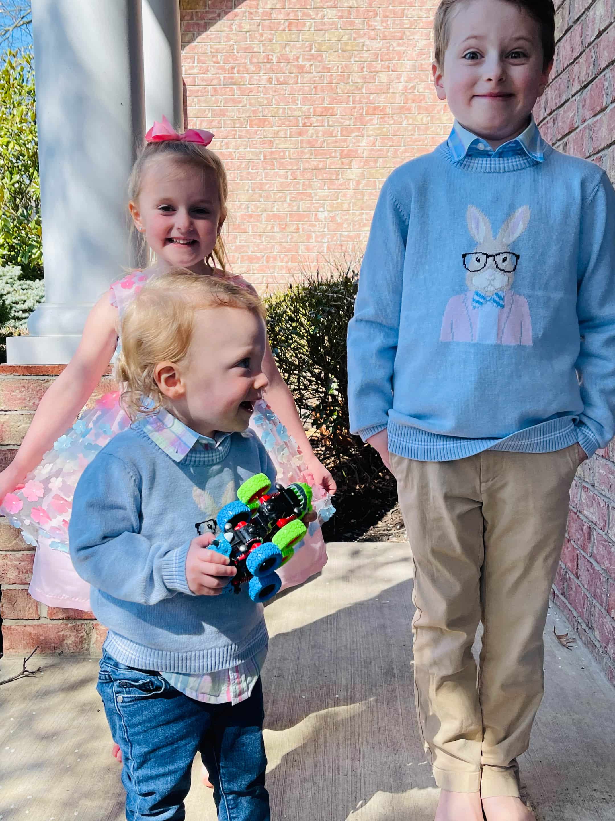 Emilia’s dress is the cutest ever! And the bunny sweaters – the boys look very studious and also really cute…