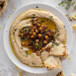 • Spread the hummus on a plate or bowl. Top with the extra chickpeas, fresh thyme and the remaining caramelized onions. Drizzle on some olive oil. Serve!