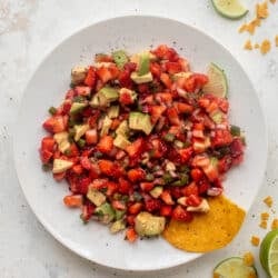 This strawberry avocado salsa is the perfect snack for warm weather! Serve cold with lots of salty tortilla chips and an icy margarita. There’s a little heat, some sweet and a rich creaminess from the avocado. Good enough to eat with a spoon!