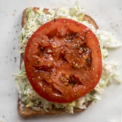 - To assemble the sandwiches, toast your bread. Spread some of the blue cheese dressing on one side. Top with a huge heaping pile of the dressed shredded lettuce. Add a tomato slice or two. If you like, you can drizzle a bit of the tomato marinade on top! This makes for a messier but DELICIOUS sandwich. Top with the bacon. Finish with the other slice of toast and serve!