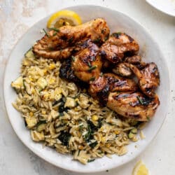 As soon as the chicken comes off the grill, I brush it with even more of the honey butter. Then serve it up with the orzo. Delish.