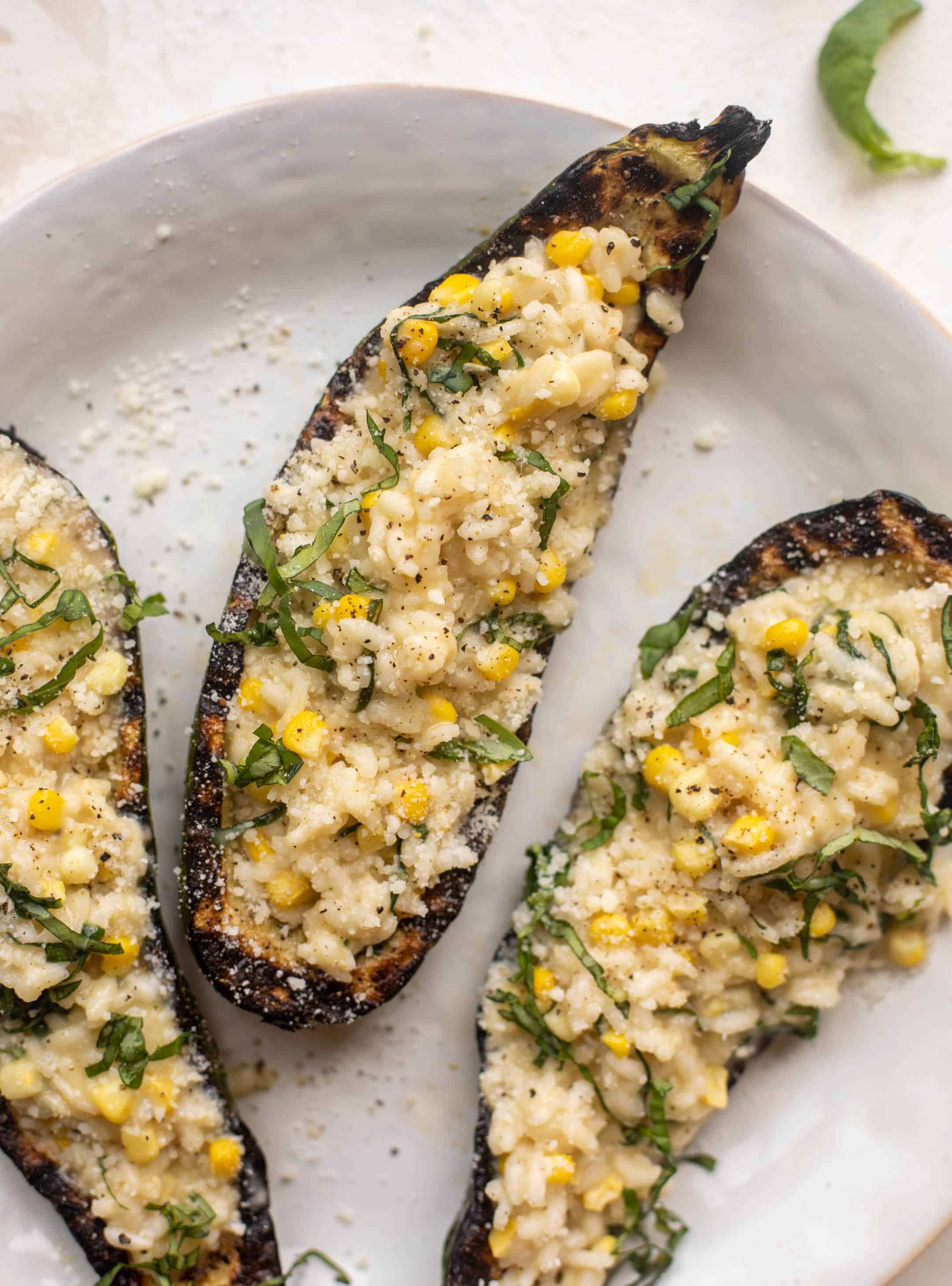 These risotto stuffed grilled zucchini boats are the perfect summer dinner! They feel elegant and fancy and are satisfying and delicious. Charred, grilled zucchini is stuffed with buttery, parmesan risotto with sweet corn and basil. So good!