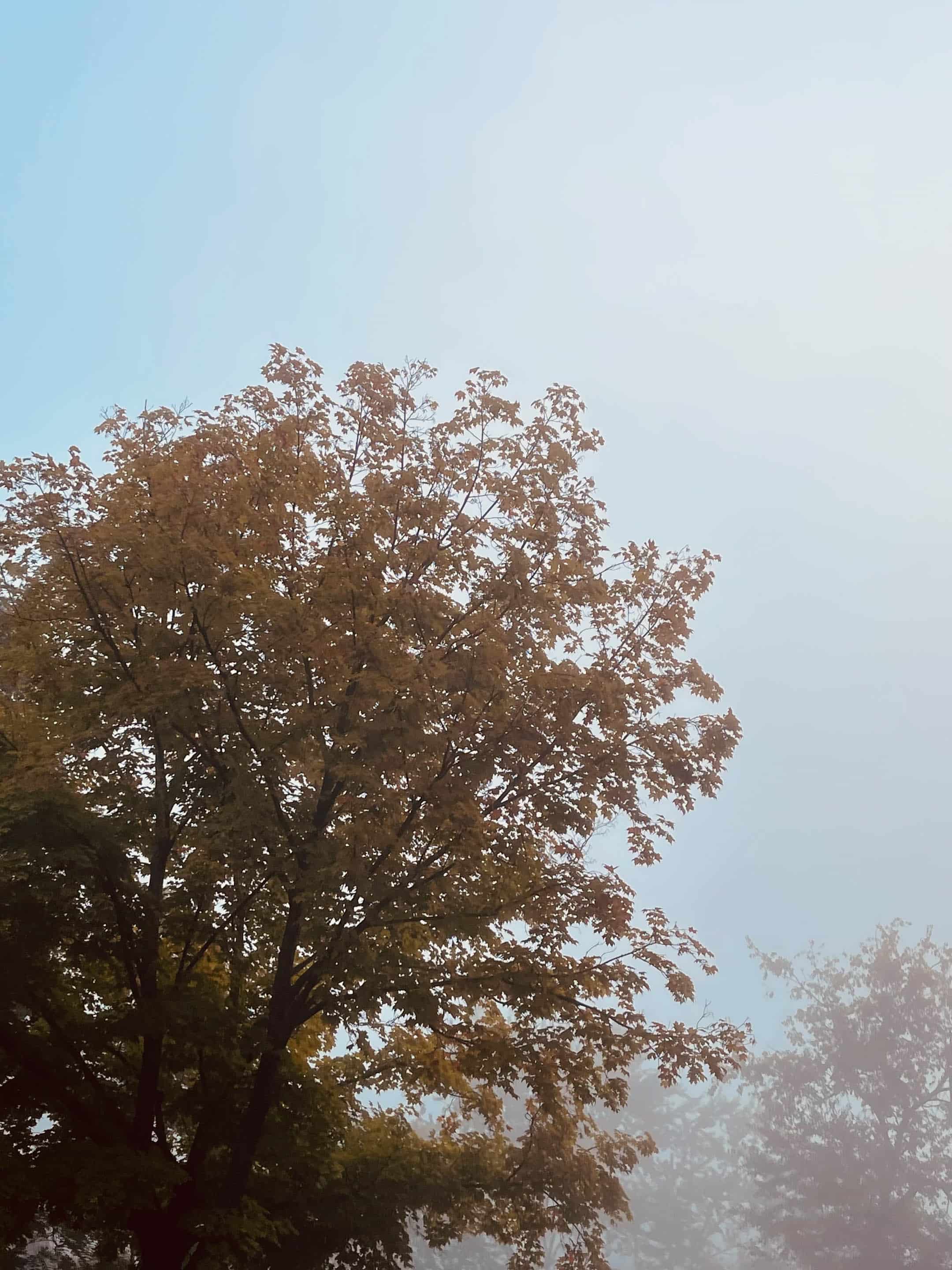 Foggy mornings going to school – this is one of our favorite trees to watch in the fall.