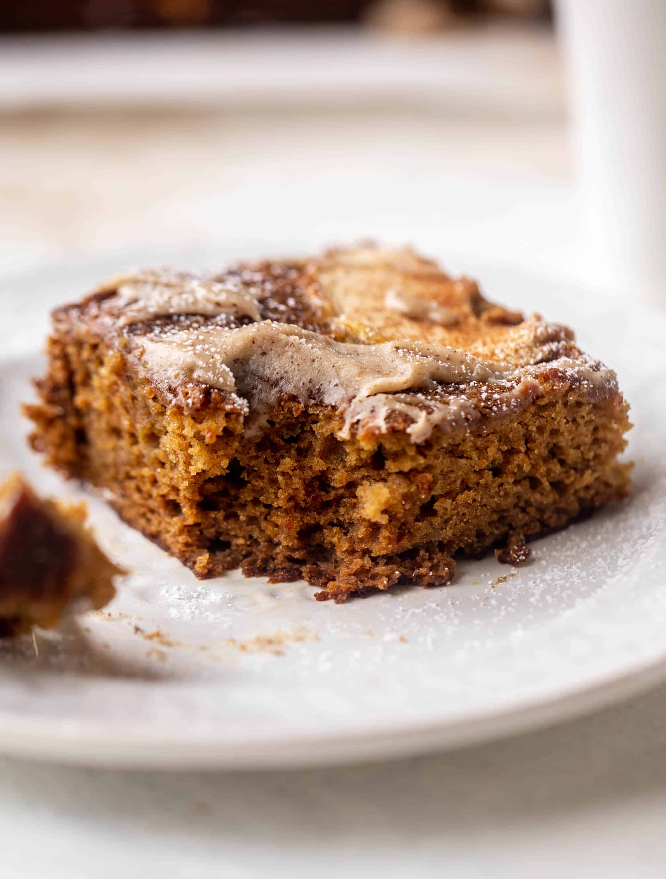 - Whisk in the powdered sugar and vanilla extract. You want a smooth glaze, so add in 1 tablespoon of milk at a time, whisking until smooth and drizzle-able. Drizzle or spread on the cake!