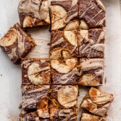 This apple butter snack cake is so perfect for fall! A sheet cake made with rich apple butter and grated honeycrisp apples, it’s baked until tender and then drizzled with brown butter icing. Incredible!