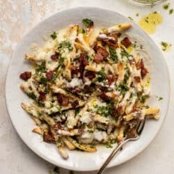 I made these fries last night and they were delicious. I gave the recipe 5 stars however i made a few mistakes last night and my fries were prob a 3.5 – 4 star with the potential to be 5 stars. lol. I did not stir the flour long enough and my sauce had a bit of a flour taste in my opinion. I also used extra sharp cheddar cheese which we all agreed was too overpowering…I will use reg or mild cheddar next time. The bacon bits were delicious as was the sauce! Looking forward to making again!