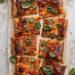 This vodka sauce puff pastry pizza is perfect for an easy weeknight meal. Rich and silky vodka sauce with provolone cheese on a flakey and buttery crust. No rising dough to worry about either! Simple and delish.