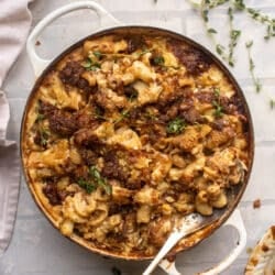 This french onion mac and cheese is a decadent twist on macaroni and cheese plus french onion soup. Caramelized onions, gruyere cheese sauce, fresh thyme and pasta come together in this baked dream of a side dish!