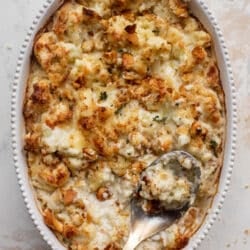This cauliflower gratin is made with smoked gruyere cheese, some parmesan, a little nutmeg and topped with dijon mustardy croutons. Baked until golden and crunchy on top, it’s almost like cauliflower in mac and cheese sauce.