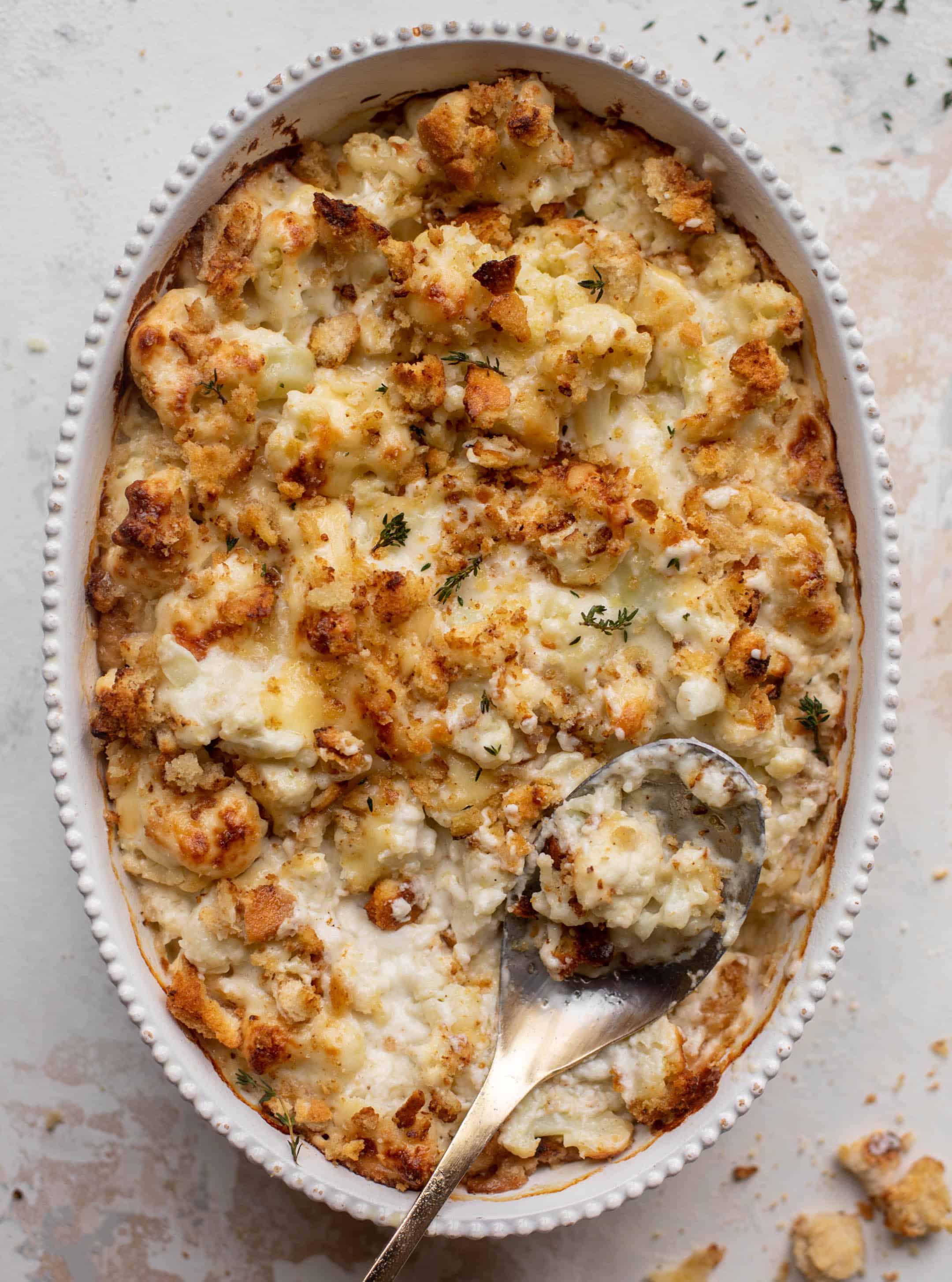 This cauliflower gratin is the perfect cozy side dish that goes with just about anything! Made with smoked gruyere cheese and crunchy dijon breadcrumbs, it's savory and decadent and delicious.