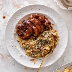 One of our favorite easy dinners, these hot honey broiled chicken thighs with orzo are so incredibly delicious. Smoky with a little heat, the chicken is sticky and juicy and the orzo is made with rosemary and parmesan. Best combo ever!