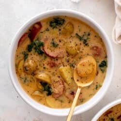 Think of the creamiest, silkiest potato soup – this is that, but also with smoky sausage!
