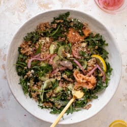 This smoked salmon farro salad is made with peppery arugula, refreshing cucumbers, pickled onions and crisp fresh radish slices. Drizzled in a red wine vinaigrette, it’s full of flavor and will leave you satisfied!