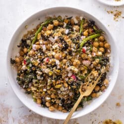 This warm quinoa salad is filled with chickpeas, kale, crunchy pistachios, creamy feta, radish, toasty quinoa and more. It’s drizzled with an incredible lemon dressing filled with herbs. And you’ll want to eat it over and over again this season.
