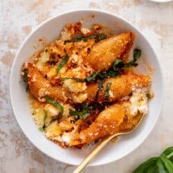 These unstuffed shells are a fun twist on the classic stuffed shells! Jumbo pasta shells are tossed in a spicy, silky vodka sauce and dolloped with ricotta cheese. Sprinkle with parm and fresh basil and it’s a dreamy meal!