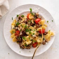 This pasta bake is not creamy. It’s not overly cheesy, but it does have lots of melted white cheddar! It has all the flavors of that classic cheeseburger dish – the seasoned ground beef, melty cheese and even tomatoes and onions.