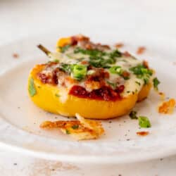 These sloppy joe stuffed peppers are incredibly filling and perfect for a satisfying weeknight meat. The roasted peppers are filled with the tangy, sweet sloppy joe mixture and blanketed with havarti cheese, then popped into the oven until melty and golden and bubbly.