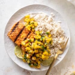 This is my favorite way to make grilled salmon, topped with fresh mango salsa and served alongside creamy coconut rice.