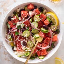 This watermelon greek salad is made with fresh watermelon chunks, sliced cucumber, kalamata olives, crumbled feta, a ton of fresh herbs and honey lemon vinaigrette.