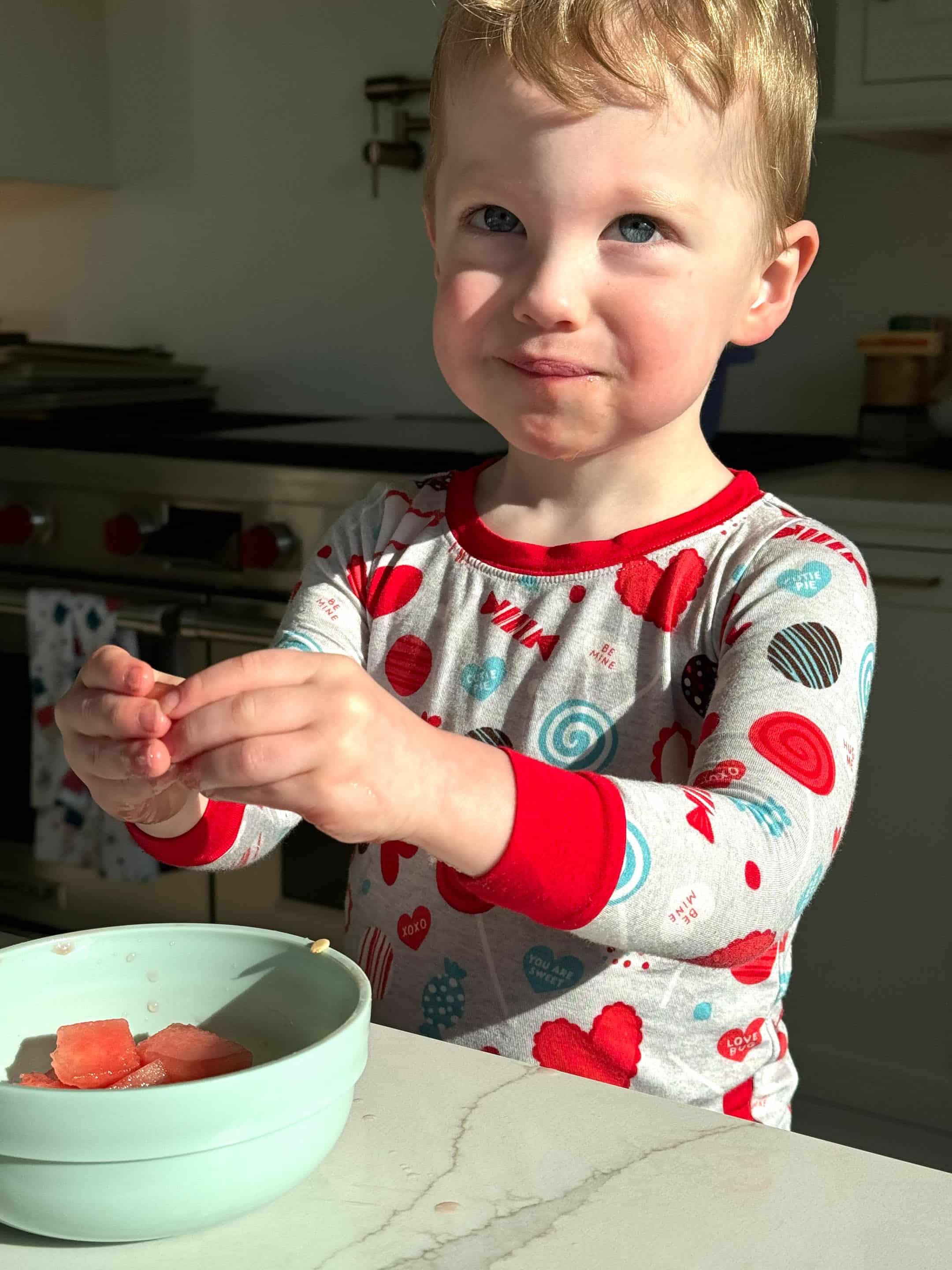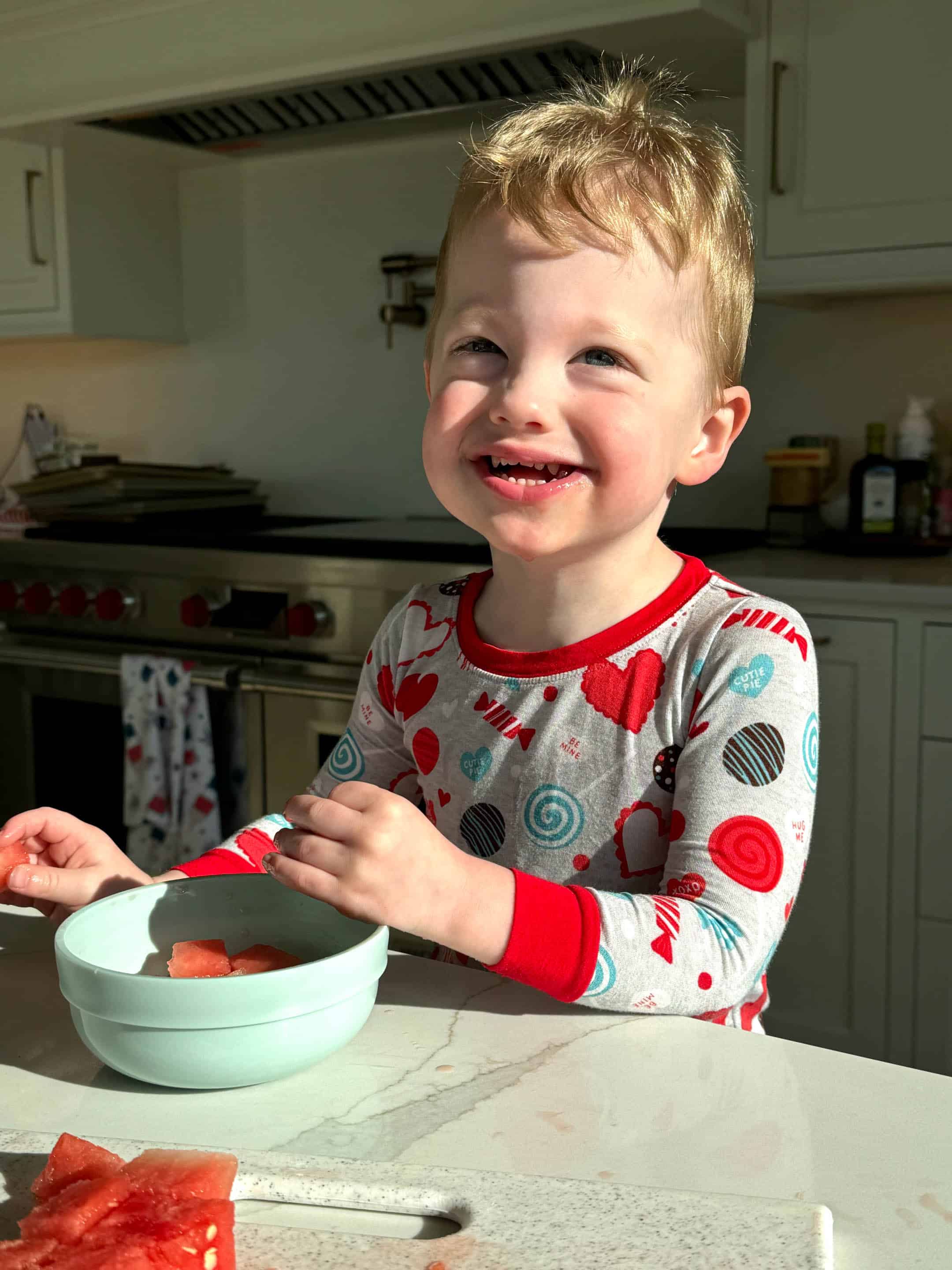 A bowl of watermelon in the early morning sun.