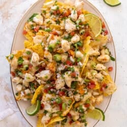 As soon as the cheese is melted and everything is warm, throw on the toppings. I like to chop up tomatoes, white onion, cilantro, jalapenos, green onions, radish and squeeze in a ton of lime juice. This mixture is SO incredibly refreshing and crisp. It not only adds a great texture to the top of the nachos, it adds wonderful flavor too.
