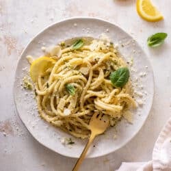 This creamy lemon zucchini pasta is so simple and flavorful. It’s satisfying and filling, loaded with summer herbs and garden zucchini and finished with lots of shaved parmesan cheese.