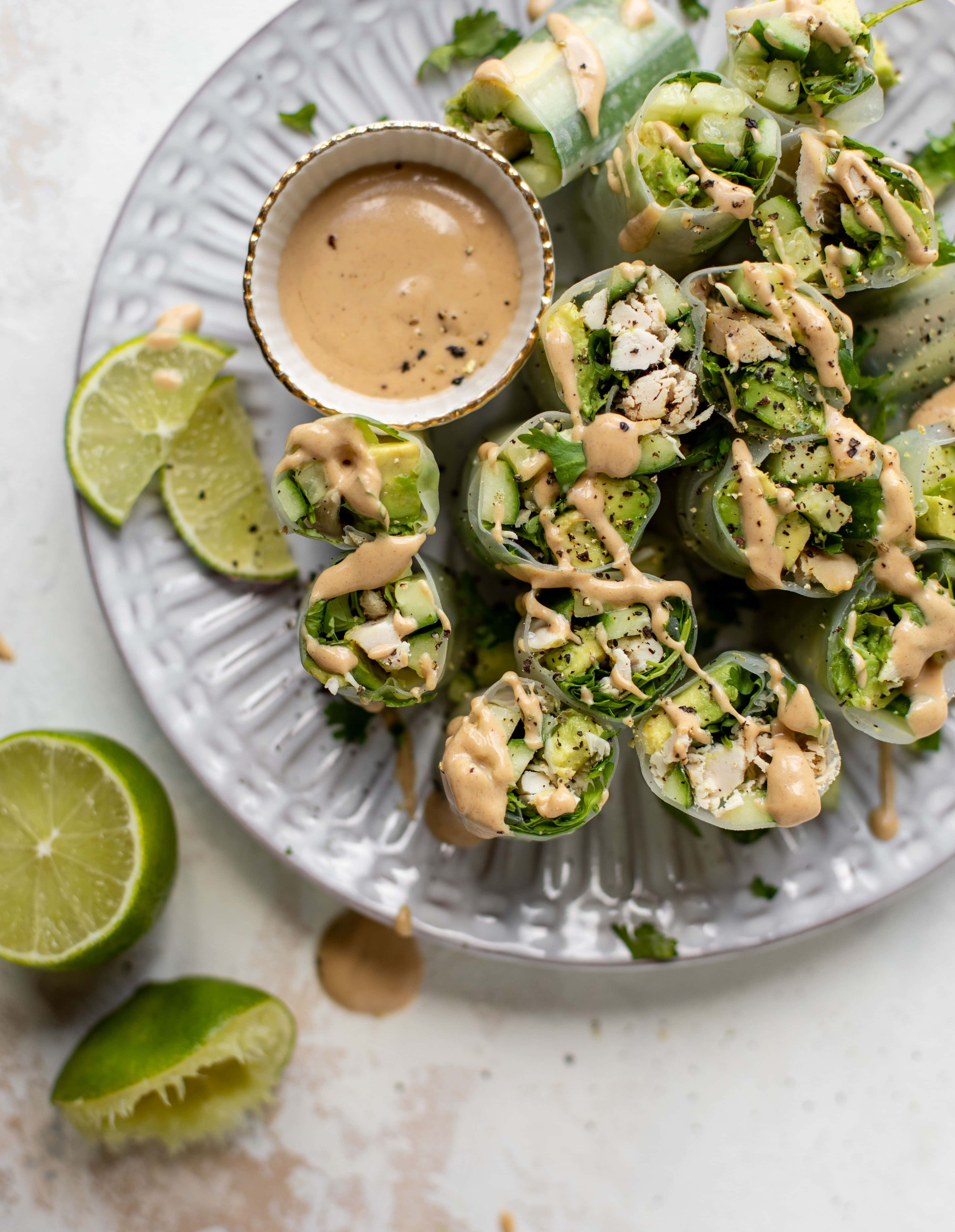 Peanut chicken and avocado summer rolls