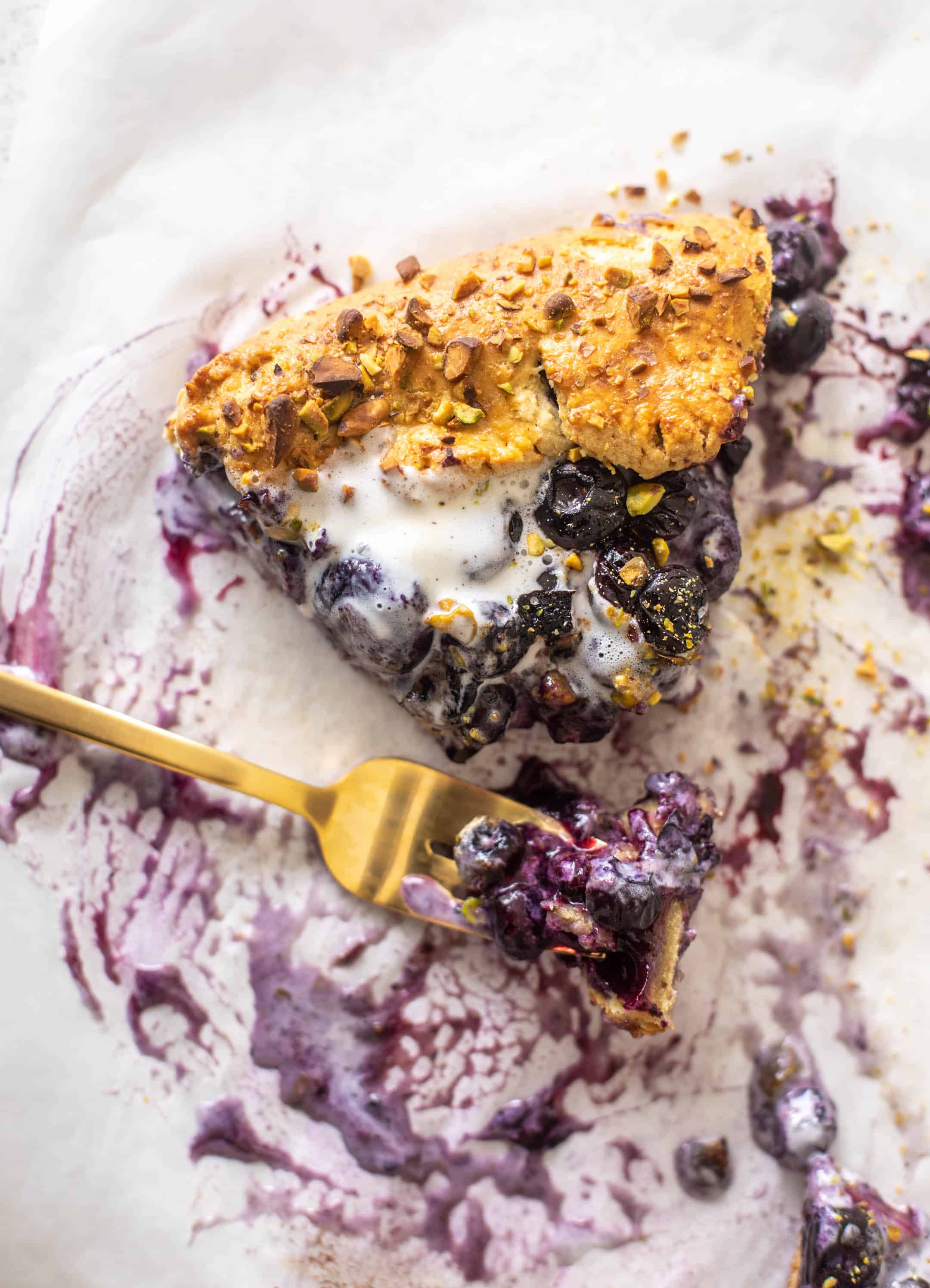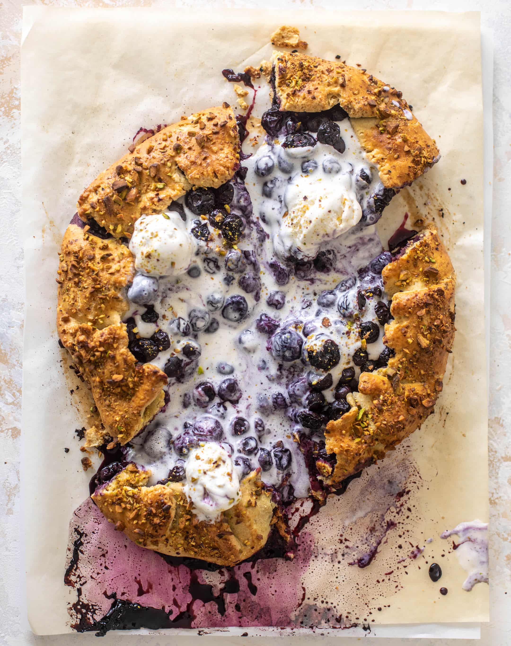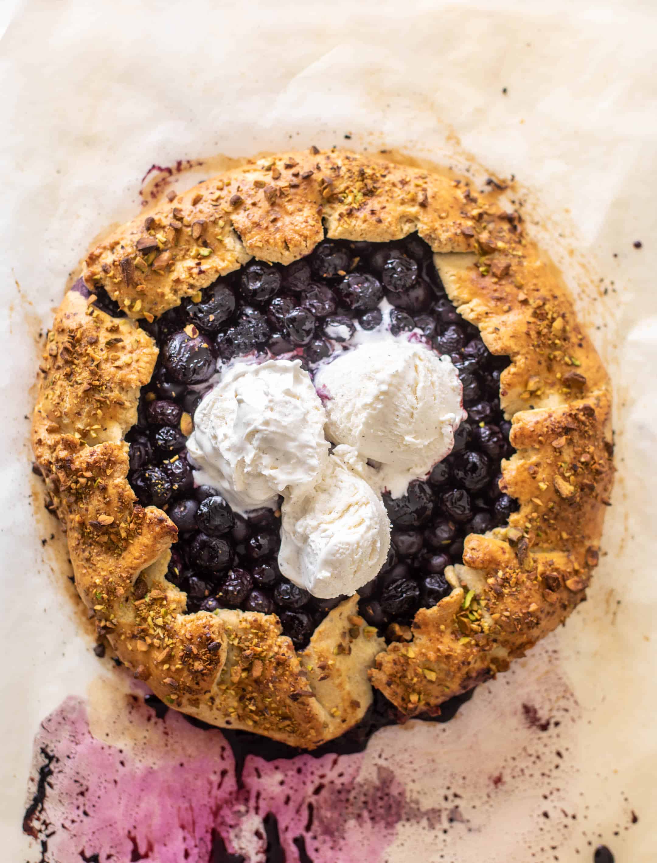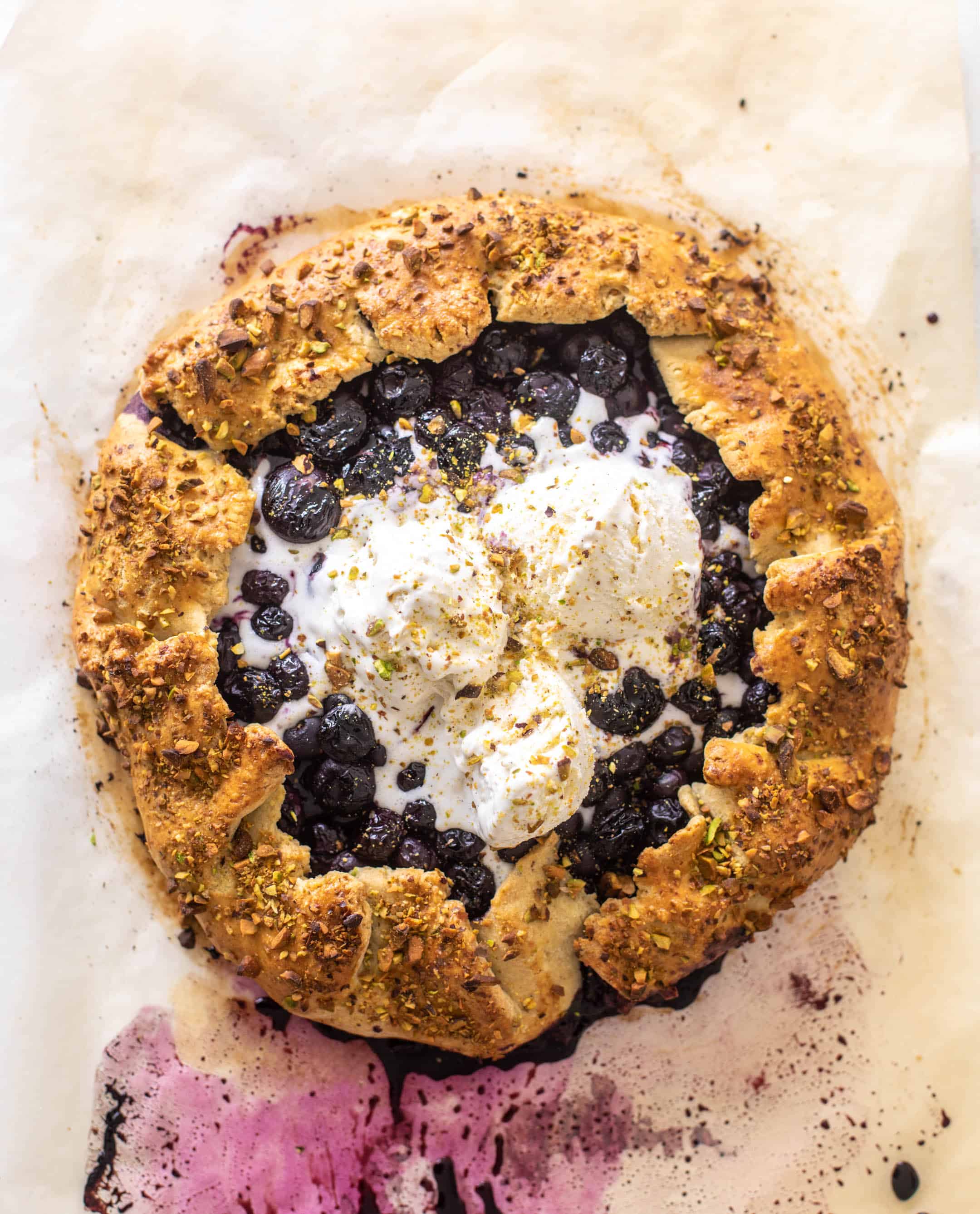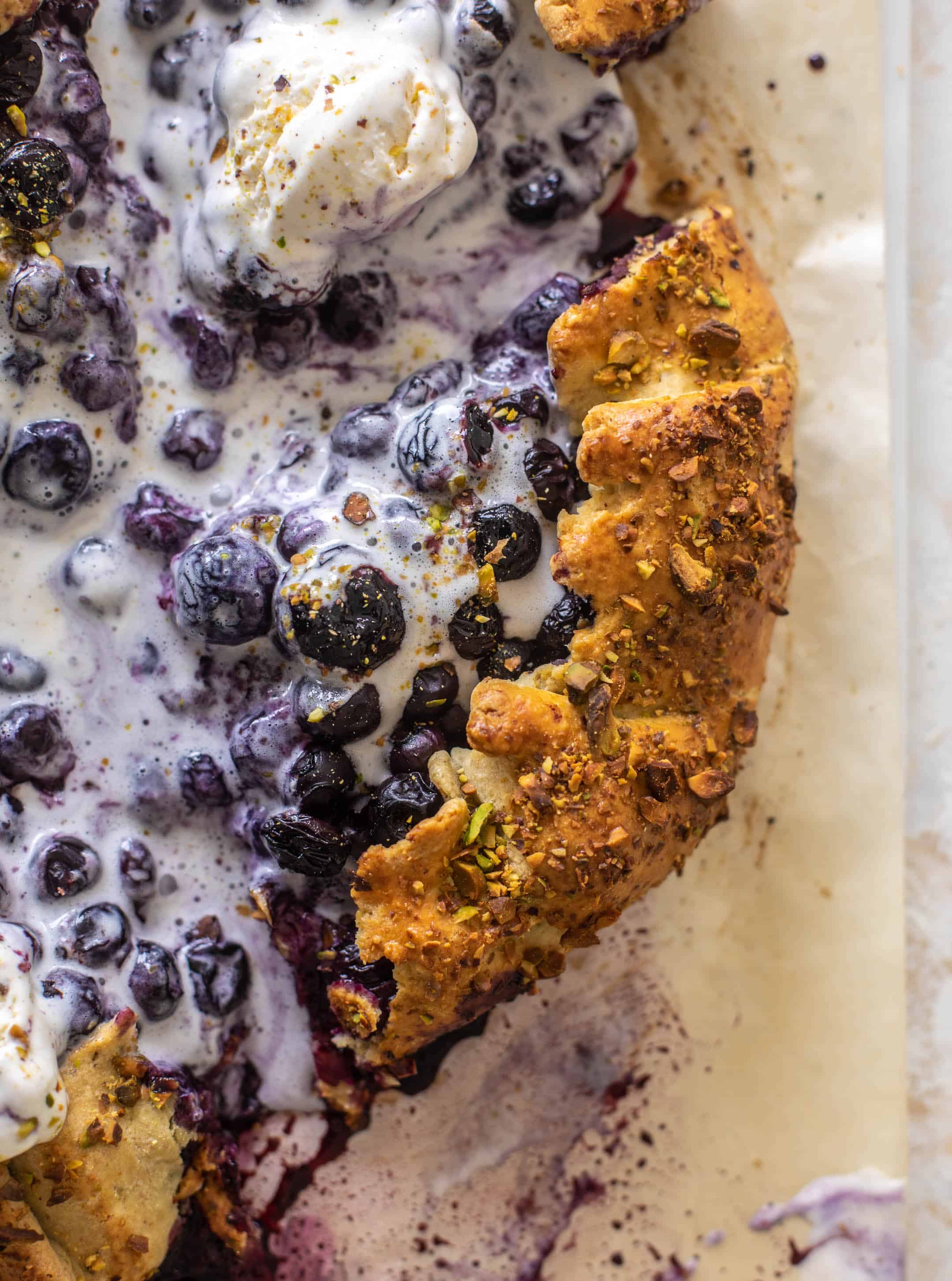 This buttery galette crust is wrapped around juicy blueberries and served with a sprinkling of pistachios, lots of vanilla ice cream and all the summer feels!