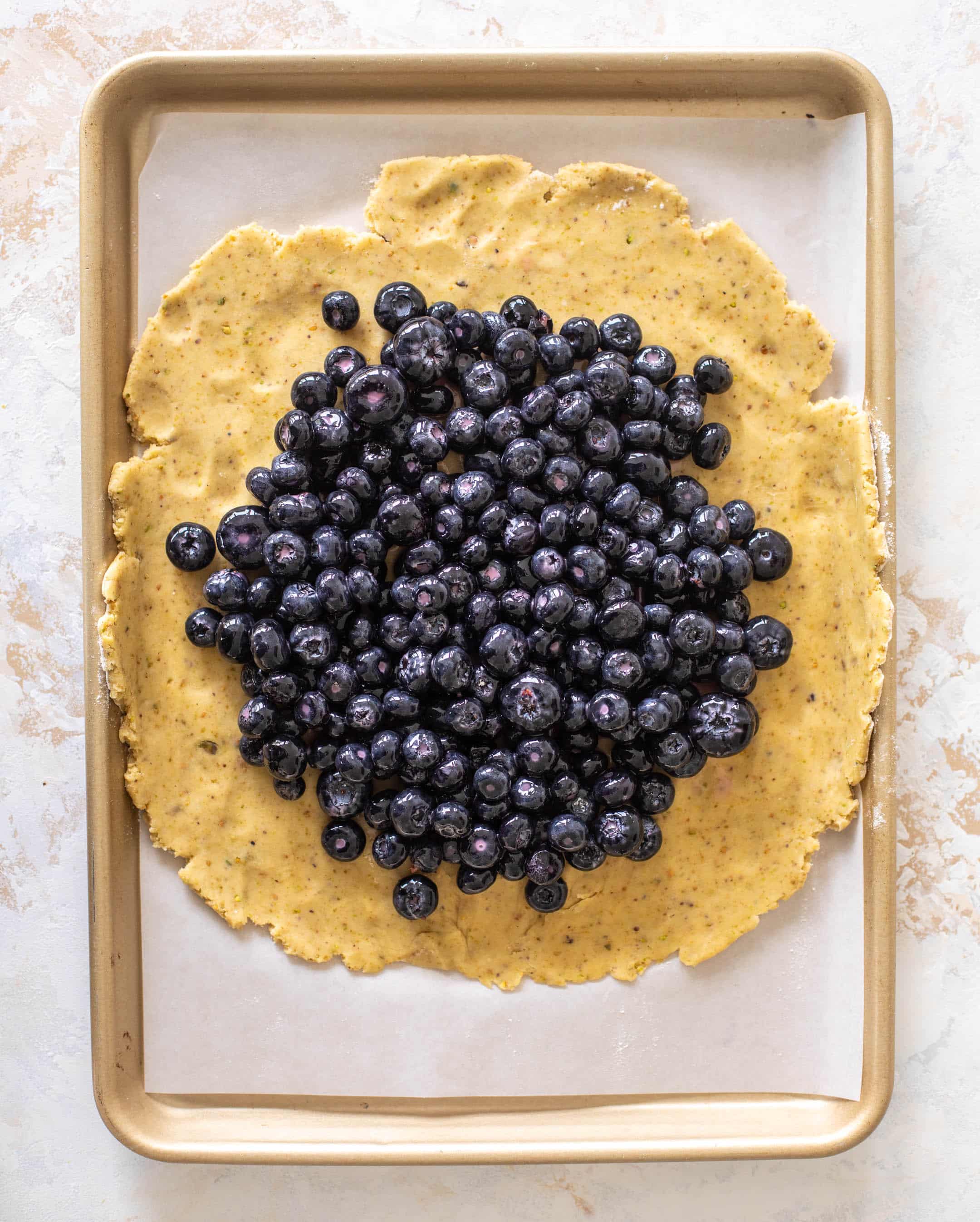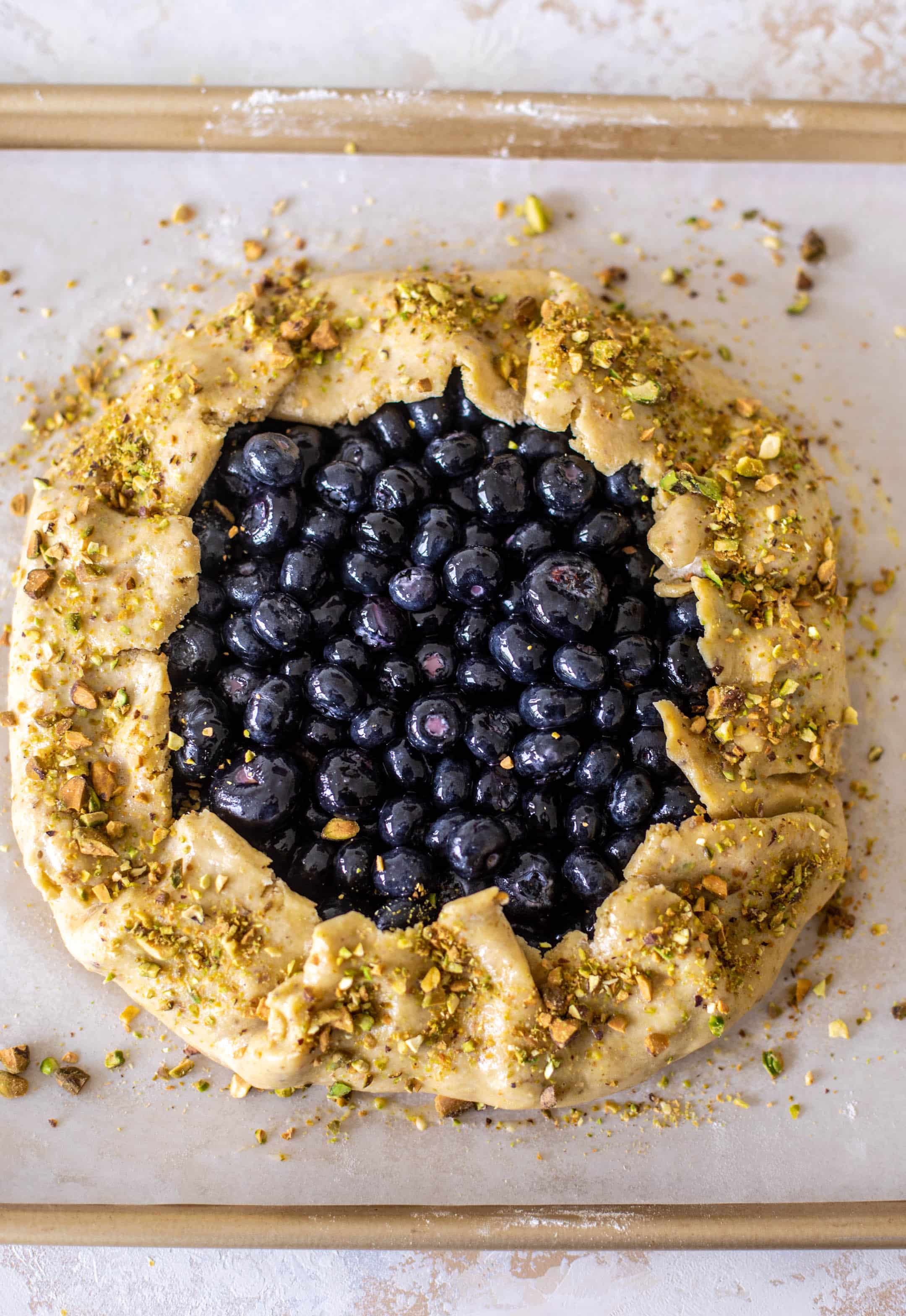 Regularly, I make a blueberry peach galette. That combo will forever be a favorite. But if peaches are out of season, I’ve got you! You can use all blueberries AND make a crust riddled with pistachios.