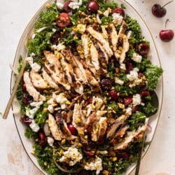 This grilled cherry chicken kale salad is so satisfying and delicious! Grilled balsamic chicken, fresh cherries, red onion, goat cheese, pistachios and an amazing rosé vinaigrette. It’s incredible!