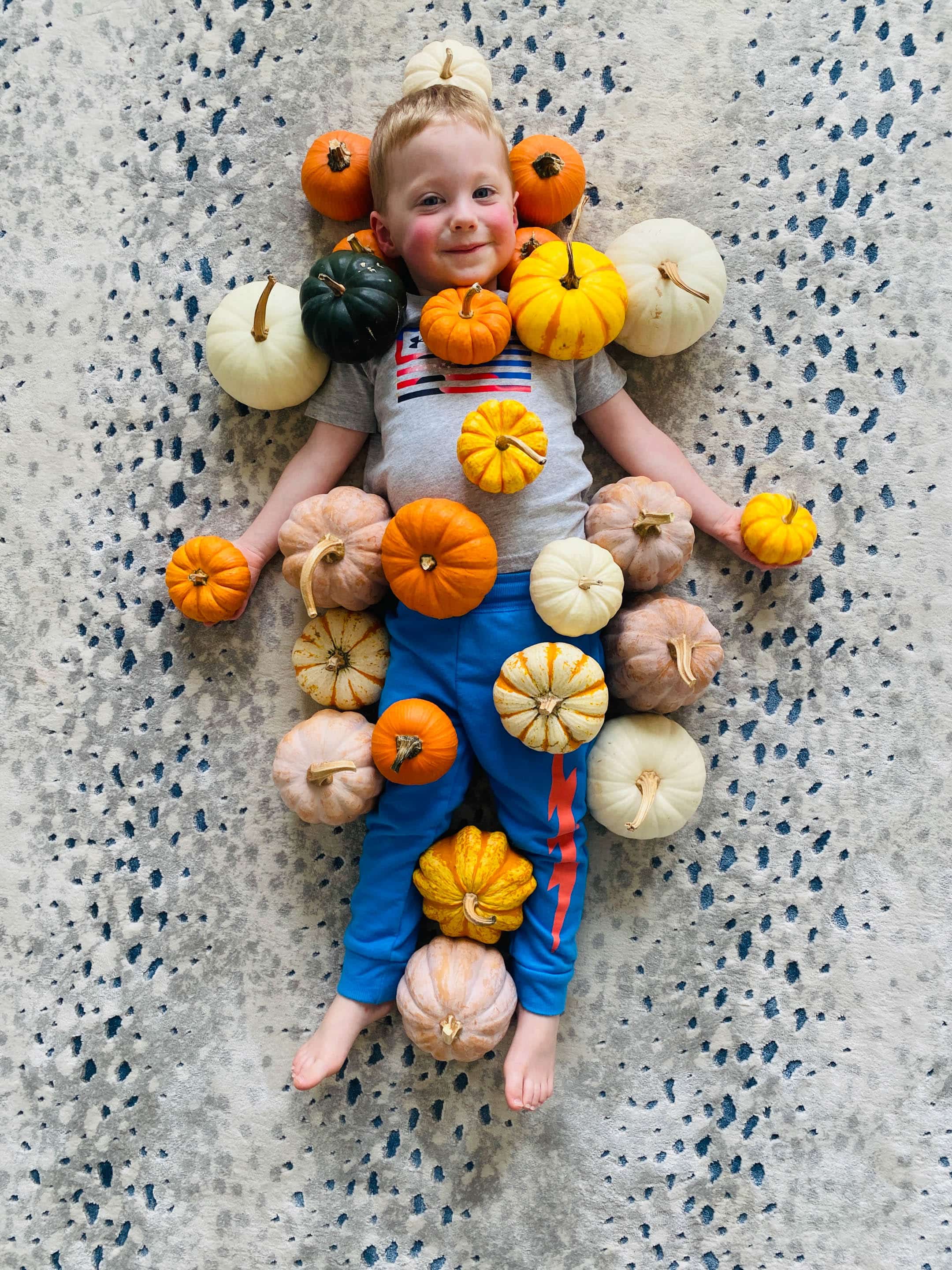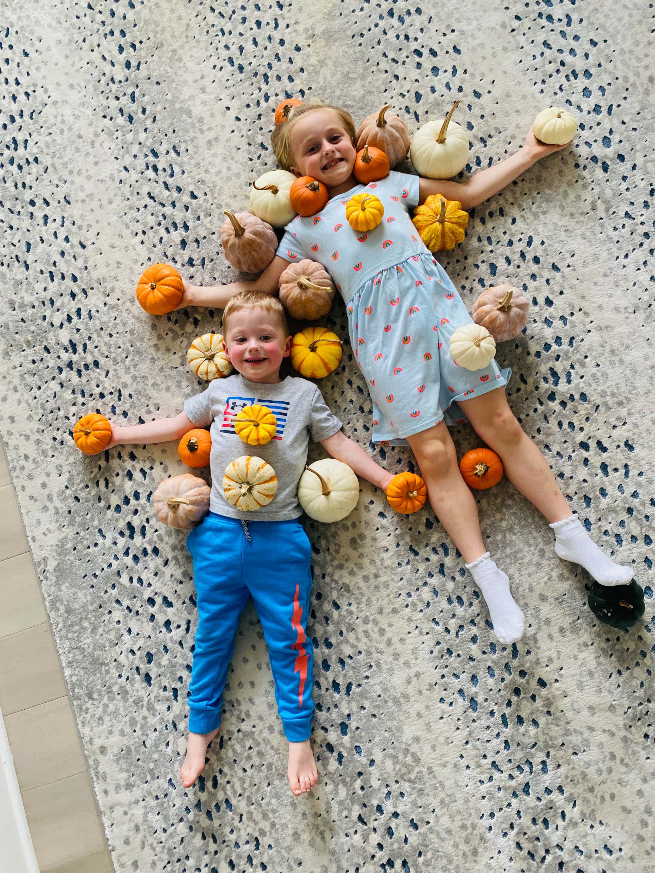 Can you tell me about the rug in the picture with the kids covered in pumpkins?