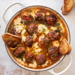 These cheesy baked meatballs are filled with pesto and topped with burrata cheese, baked until melted and served with buttery little garlic toasts for dipping.