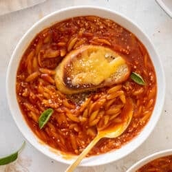 This tomato orzo soup is seriously a giant cozy hug in a bowl. A silky tomato broth is filled with orzo pasta and topped with crunchy cheesy toast bites, making it a huge family fave.
