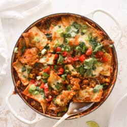 This is one of those ultimate comfort food meals. It’s like a casserole in a skillet and you spoon it into a bowl… and eat! It’s just cozy. Comforting. Crush some chips on top or even use them to scoop this up.